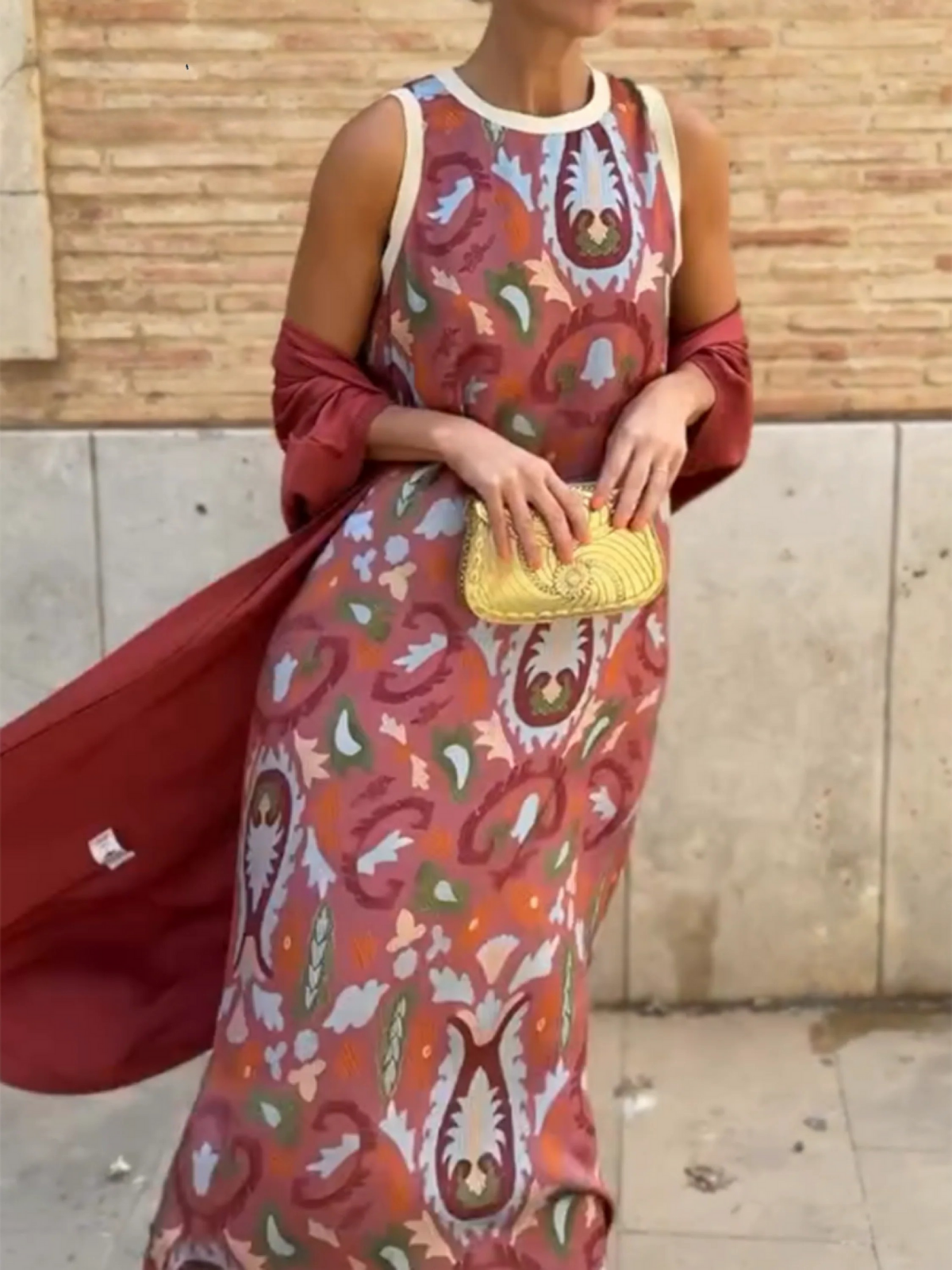 This two-piece satin set combines a flowing printed dress with a matching lightweight cardigan — perfect for brunch dates, evening gatherings, or relaxing weekends. Its silky texture and graceful fit create a look that feels as refined as it appears, offering effortless charm from day to night.