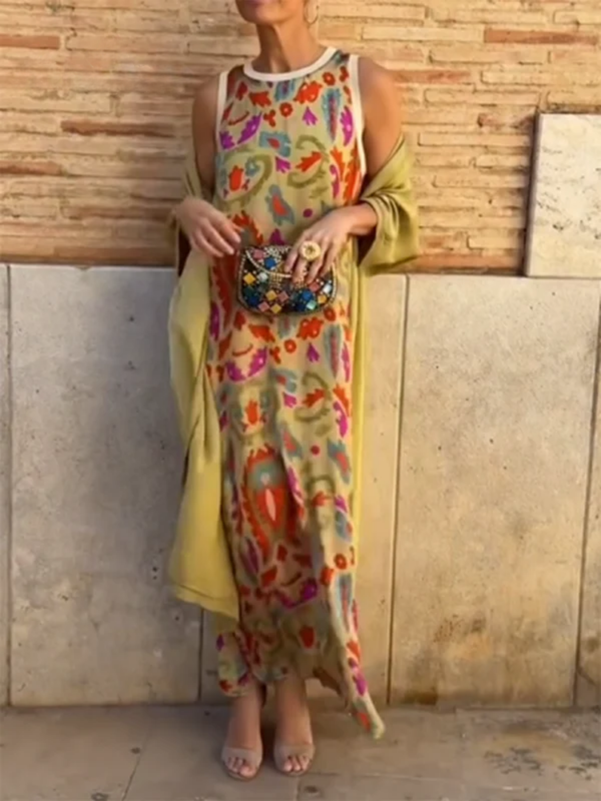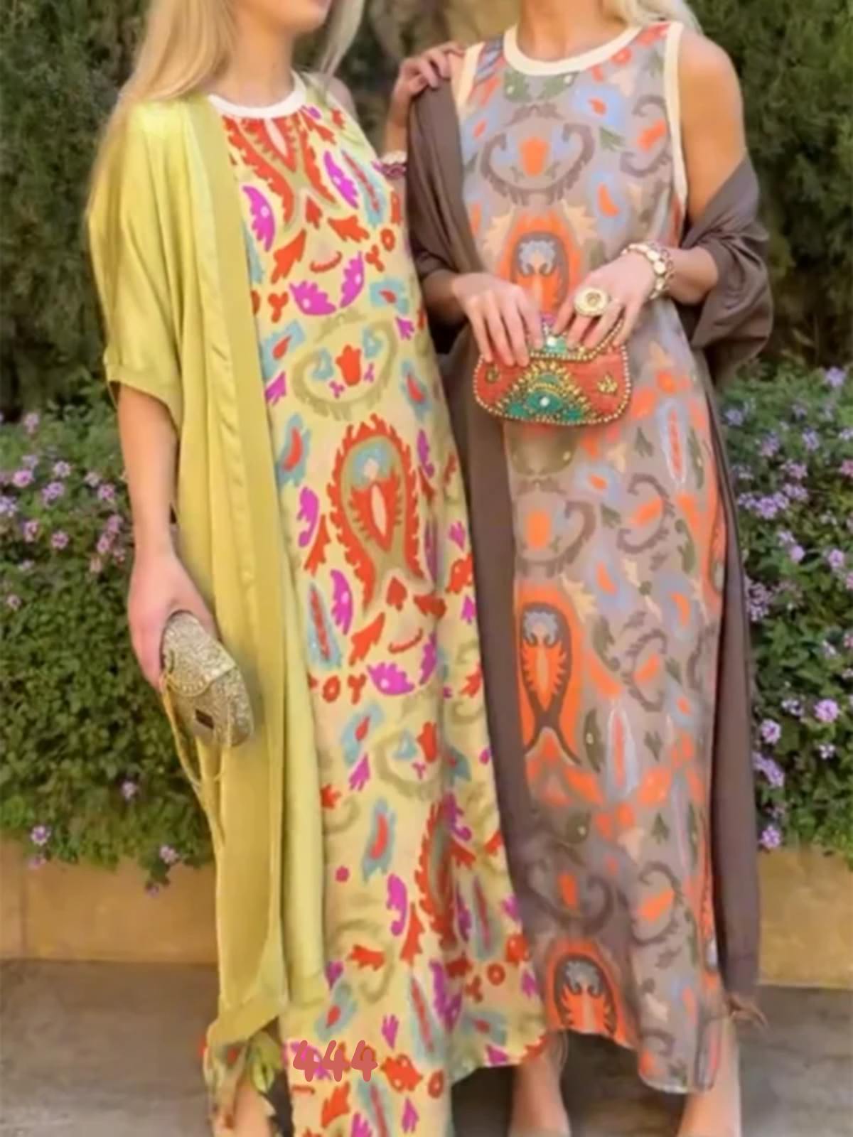 Women's Printed Satin Cardigan Dress Two-Piece Set